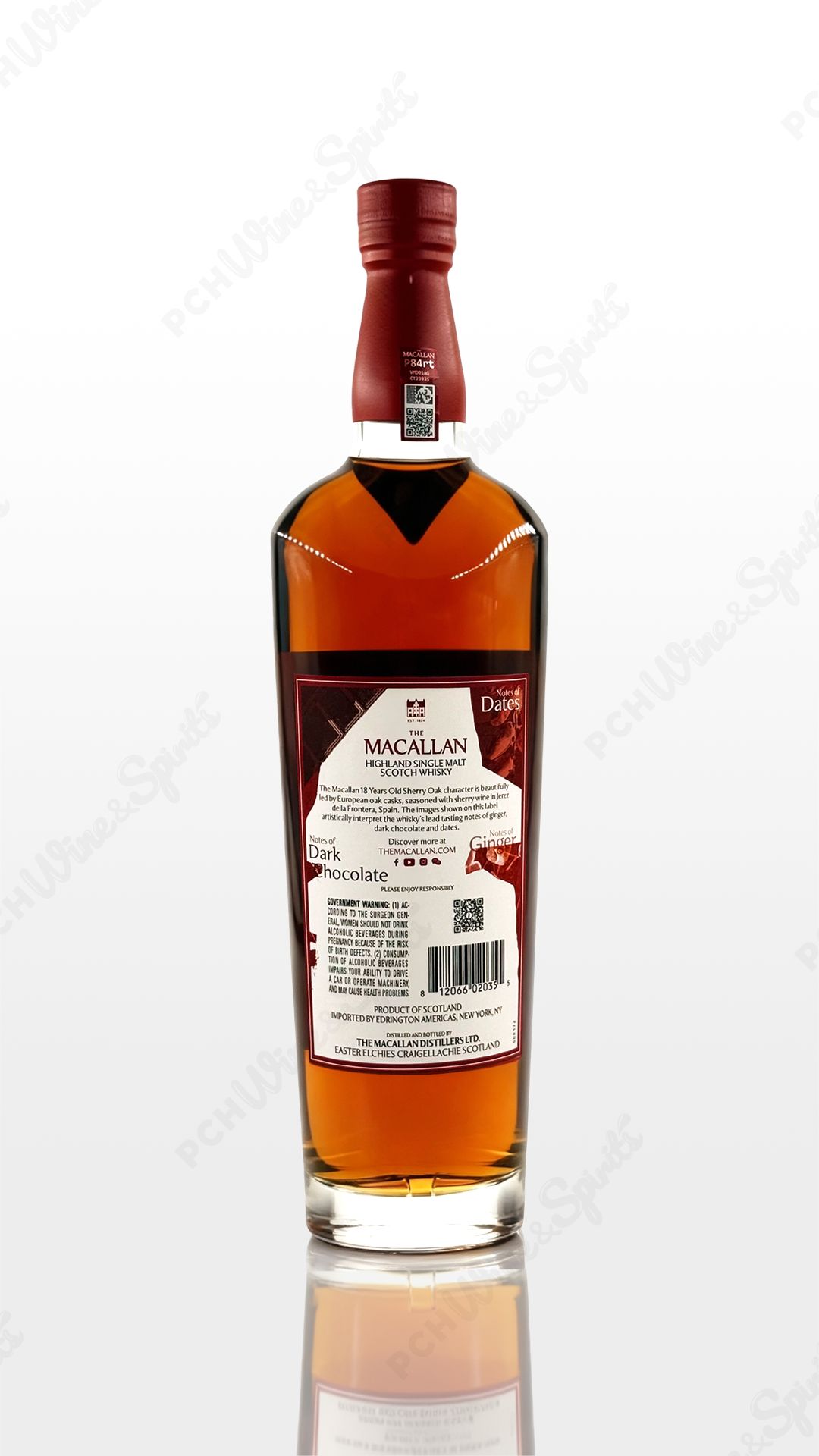 Matured in hand-picked sherry seasoned oak casks from Jerez for richness and complexity, where they are sourced, crafted, toasted and seasoned by Macallan’s Master of Wood. Macallan knows that’s its the oak that makes the true difference to the quality, natural color, unique aromas and defining taste at the core of this single malt whisky. This is a whisky that demands to be savored, a nose of orange zest and jam, with a full bodied palate of mature oak, ginger, dried apricots and raisins in a soft mahogany color.